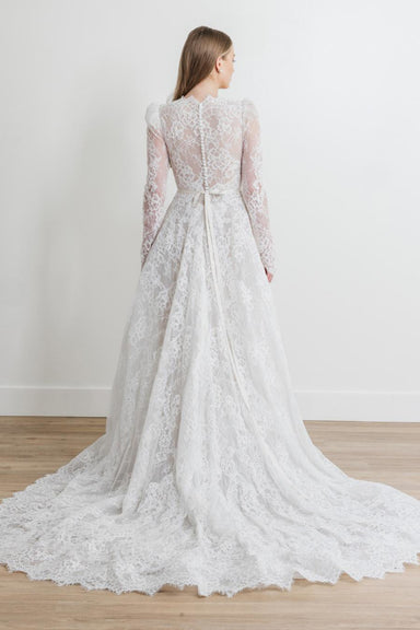 A classic A-line gown made of floral embossed jacquard fabric, featuring a modern square neckline, a front slit, and buttons that extend down the b...