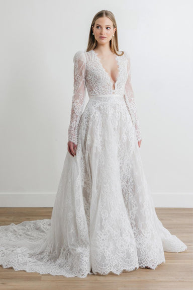 The Watters Love dress is a romantic A-line wedding gown made of corded lace with a plunging V-neckline and long sleeves. It features a moiré ribbo...