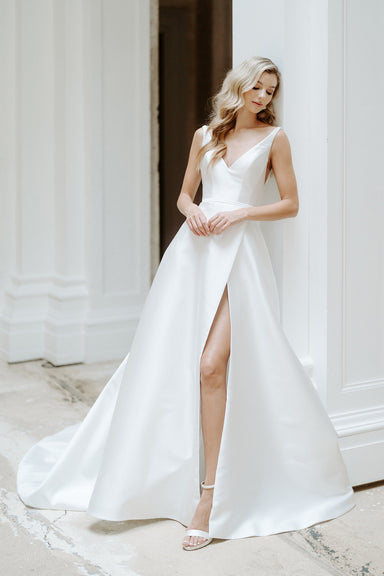 Stunning Coworth has a v-neckline, corseted bodice with daintly straps. The A-line skirt has a beautiful split and a long train, made in our Fine...