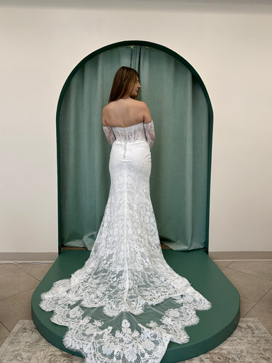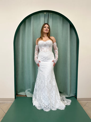Beautiful lace fit and flare gown, strapless with exposed bodice detail!