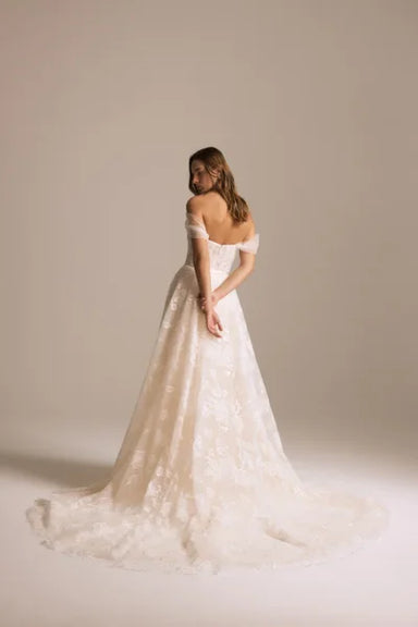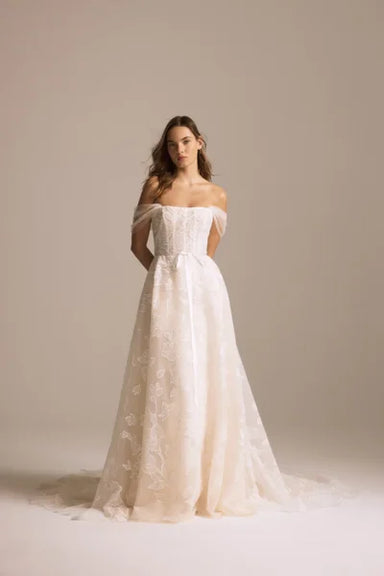 View full detailsThe Morilee Karissa wedding gown features an elegant off-the-shoulder neckline that beautifully frames the shoulders and collarbone. Its flattering...