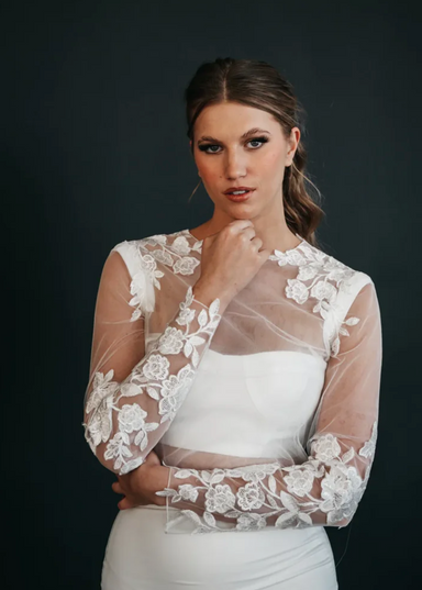 Original Price $525.00Current Price $400.00| /The Maggie Sottero Danae jacket is a detachable, vintage-inspired bridal jacket made of tulle with beaded lace accents and long illusion bishop sle...