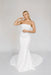 The Alyssa Kristin Liv is a sophisticated, modern wedding gown known for its sleek stretch crepe fabric, strapless bias bandeau neckline, boned bodice for support, and a long, dramatic train, embodying simple elegance for the chic bride who wants a classic but contemporary look. Designed to hug the figure, offering a timeless silhouette.