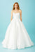 The Lea-Ann Belter Margherita is a strapless, mikado ballgown featuring a corseted bodice with a scooped neckline, a defined Basque waist, and a full, gathered skirt that flows into a chapel train, blending classic elegance with modern princess style, handmade in Canada with meticulous attention to detail and luxurious fabrics.