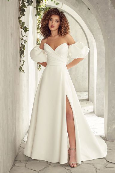 View full detailsIntroducing the Mikaella 2403, a stunning satin faille wedding dress. The strapless draped bodice is complemented by separate puff sleeves and fabr...