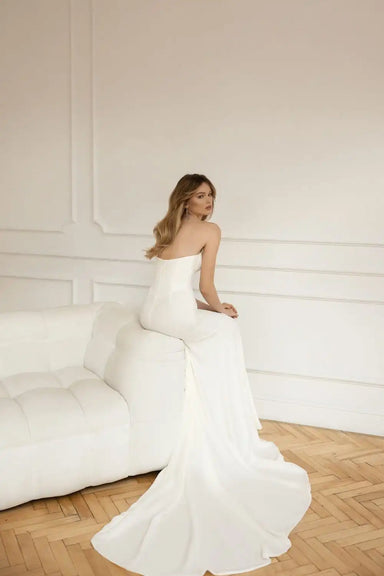 View full detailsIntroducing the Eva Lendel Artemida gown, a minimalist masterpiece in soft, luxurious crepe. The relaxed mermaid silhouette is accented by a classi...