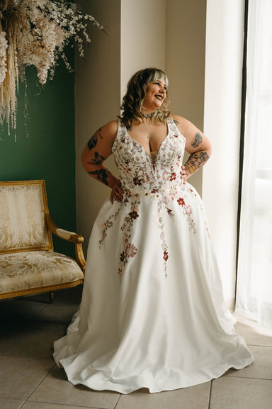 Delicate flower appliqués on the illusion sweetheart bodice, our Ayla gown is ultra figure flattering thanks to the boned and corset netting. These...