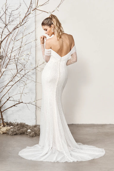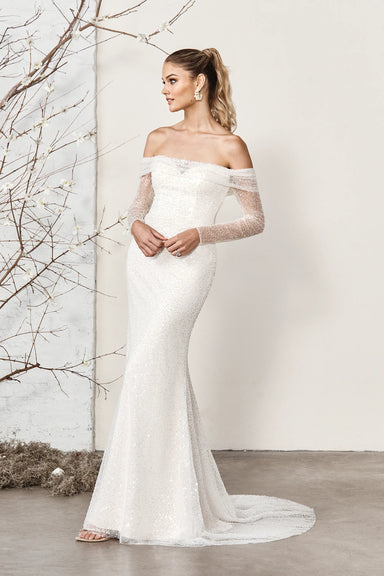 Graceful and light, this fit and flare bridal gown features a romantic cuffed off the shoulder neckline with long sleeves. Feminine allover beading...