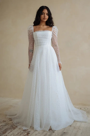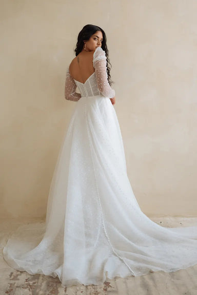 View full detailsIndulge in the enchanting versatility of the Jenny Yoo Evangeline gown. Made with playful French dot organza, the pleated bodice enhances your figu...