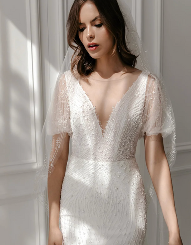 Stunning beaded designs adorn this fit and flare gown with puff sleeves.