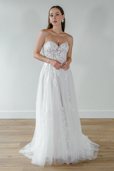 Charming tulle A-line gown, sparkling with pearls and sequins throughout.