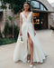 ayra is a fabulous gown for a royal wedding look. A wrap-around dress is made of gorgeous glossy fabric. The gown is embellished with a V-shaped neckline and long loose sleeves with take-ups in the shoulders zone. The dress with wide gathers has a high cut. A belt with a buckle highlights a waistline. A fantastic skirt passes into a tremendous train.