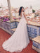 Classic floral lace and crepe wedding gown with a deep V-back and thigh-high slit.