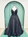 Stunning black A-line gown with thin straps and unique applique!